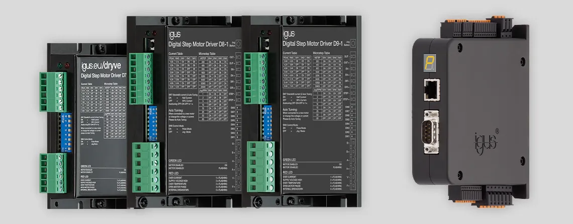A: igus® offers motor controls for stepper, DC and brushless DC motors. With the D1, all motors from igus® and motors from other manufacturers can be controlled. For DC motors, the D3 and D5 controllers are ideal. Finally, the D7, D8 and D9 can all be used to control stepper motors.