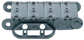 In this version special plastic glide shoes are mounted on the side of the chain link every 1,000 to 2,000 mm. The function of these guide elements resembles the leeboards used on sail boats. Some of these leeboards are conceived in such a way that in contact with firm ground they pivot upward and enable the continuation of the travel. Similarly the glide shoes in AUTOGLIDE go up and down, each according to its position as lower run or upper run of the chain. They provide the precise lateral guidance and a smooth glide of the e-chain®.